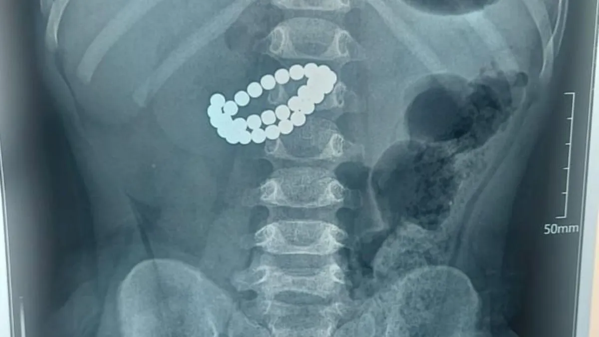 Қабылдау бөліміне 1 жас 9 айлық бала өте ауыр жағдайда жеткізілген. Тексеру нәтижесінде дәрігерлер "ішектегі бөгде заттар – 31 магнит, жіңішке ішектің көп жерден тесілуі, перитонит" диагнозын қойды.